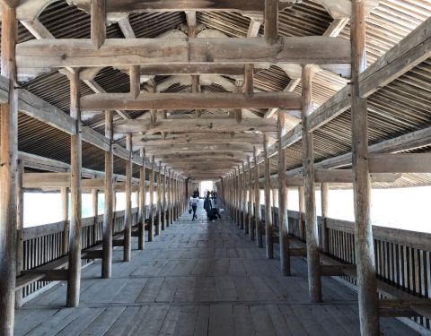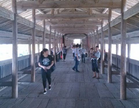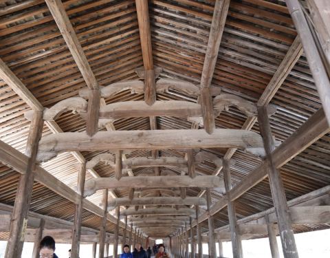 游览的时候,桥上偶遇一老者,他像如数家珍一样介绍起了这座桥,它建于公元1465年,至今已有553年,桥长125.7米,宽7.5米,桥墩有五个,立柱有184根,两侧的长凳有72条……现全国重点文物保护单位。 大多数的廊桥...