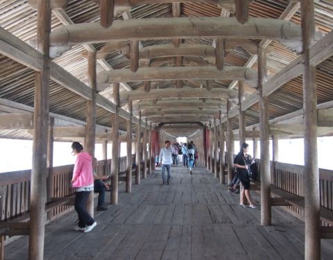 下高速,一会功夫就到了。该桥为木石结构的廊屋桥,全长125.7米,其下砌石墩5座,4孔,桥上廊屋42间,重檐顶。当心间屋顶升起,为歇山顶,翼角起翘。 永和桥桥两端有桥头堡,各为石台阶27级。桥梁采用筒支、悬臂...