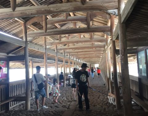 廊桥,在我国,已经有很悠久的历史了,我国也有很多廊桥。这次带着小朋友一起去看的是处州廊桥,它位于丽水,迄今已有1400多年的历史。带着小朋友走进这样的历史建筑,希望他通过这样的游玩,了解到我国的历史,学到更多的知识。 我们踩着长长的石阶,才正式走入廊桥里面。廊桥的入口处放着一块对它的介绍的碑文。 一走进廊桥,还是有些惊讶的,整座桥好像都是木头搭建起来的,经过了那么多年的风雨,还依然那么完好的在这里给大家参观,不得不赞叹古人的伟大之处。 我们在廊桥上看到一些当地的老人坐在桥两排的长凳上,有在互相交谈的,有坐着看看外面的风景的,当地人依然在使用着。