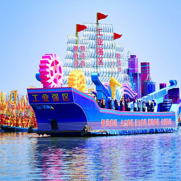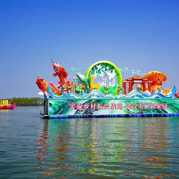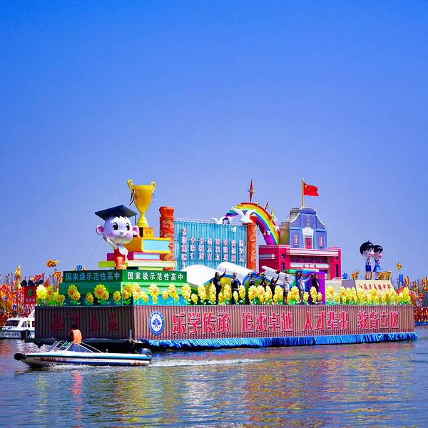 会船节气势宏伟,花船做的又高又大。色彩鲜艳夺目。划船的表演者的精彩表演让人振奋精神。