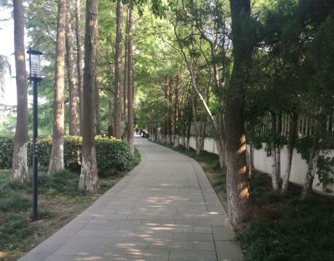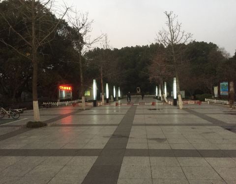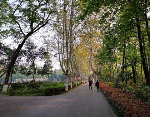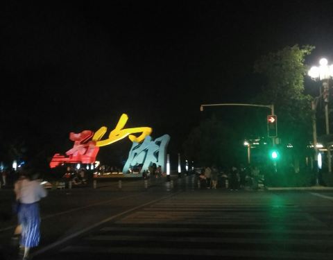 雨山湖公园南门上雨山湖三个大字,十分醒目。湖南路则是柳岸花堤,天水一色,是人们憩息的好地方