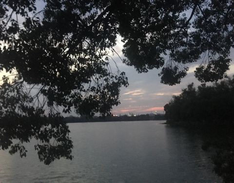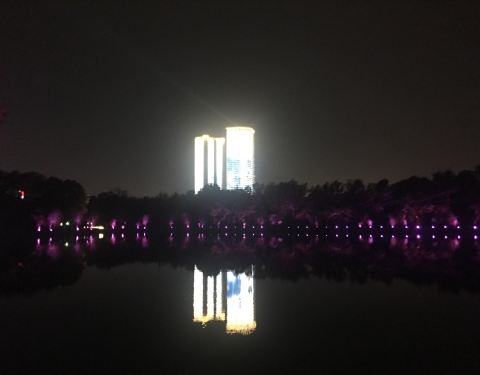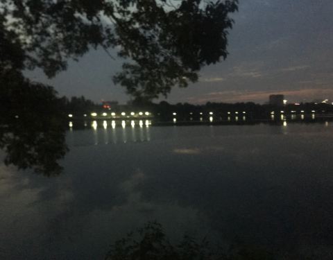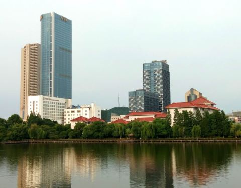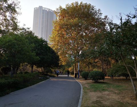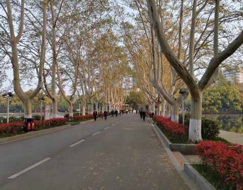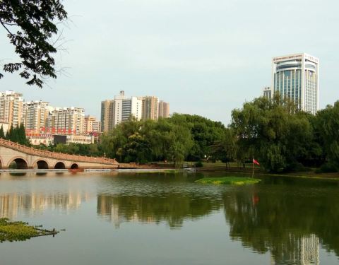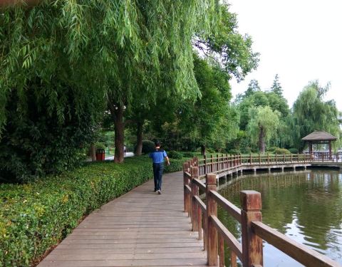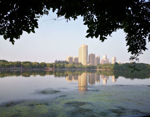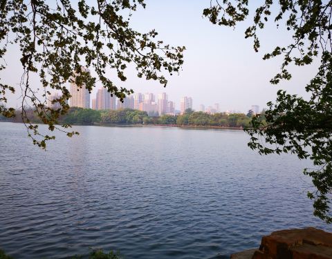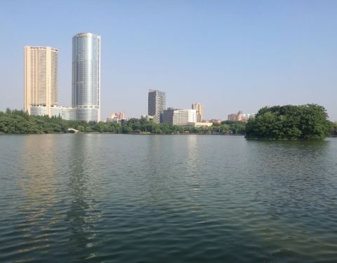 湖周围垂柳倒映,高楼成群,为市中心风景区。这里傍晚湖边运动的市民很多