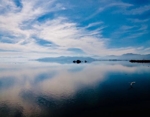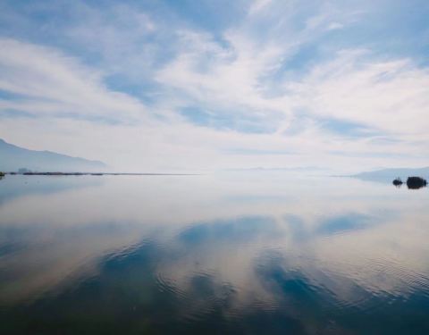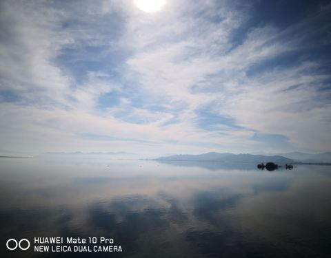 宽阔的水面,辽阔的背景,水面特有的植被。天水相接。注意防晒。