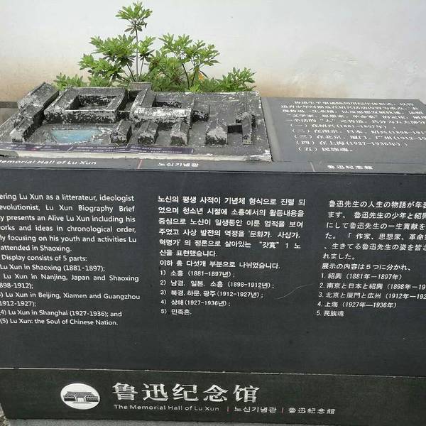 这个景点是免费的,刷二代身份证可以进入,这个标识做了一个纪念馆的平面设计图。从这个门进去这里的游人照比鲁迅故居少了不少,可以很轻松的游览,进了这个门后就看到一个院子进到这个院子后,从正面的大门进去,正中就是鲁迅的雕塑从雕塑的左右都可以进去参观,介绍了鲁迅家族的历史演变,以及鲁迅的生平,有个电视再演播这鲁迅的作品,以前小时候我看过的一部电影《阿Q正传》,我们饶有兴趣的看了一会,找到了小时候的那个感觉.......正中还有个戏台,13:00开始播放社戏,鲁迅的祖父很厉害,中国进士,当过翰林这个画面左边的人物是鲁迅的父亲,在他这时候,家道开始衰落了,他也得了病,在鲁迅15岁时就去世了,在鲁迅的作品《朝花夕拾》中提到给父亲配中药的事,还有那些奇怪的“药引子”,成对的蟋蟀,六月不融化的雪水.......对中医的一些控诉,右边的人物就是给他父亲治病的老中医,很有点意思吧。看完展览,从进门的广场向西,有个雕塑是鲁迅在日本读书时的老师藤野先生,出了西门就游览完毕了,细细的看一下,大约1小时左右的时间。 展开