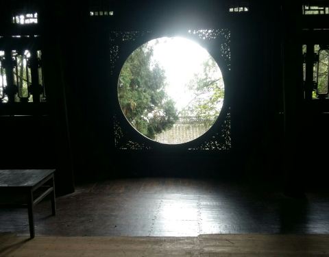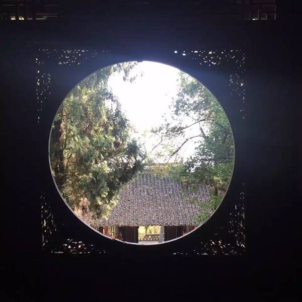 第一张照片圆窗高致,外仰匾题庄严,内眺湖山胜景。山上寺庙体现了宋代《营造法式》所总结的建筑风格