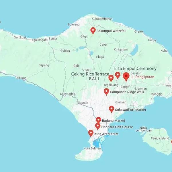 上图标注出来的景点,可以选择性前往,基本来说4-5天是能够做到全部走完的,不过如果不想那么赶的话,像当地市场就可以选择1-2个前往,外加对钻进森林的兴趣不大的话,也可以选择不去West Bali National Park。