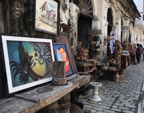 街道上的每块石板都非常古老。游览古镇最普遍的方式就是坐上穿梭于街道上的花哨的两轮小马车。街道上遍布许多艺术品店和古董店,不少商店里可以看到中国风格的东西,有的商店琳琅满目,百货商品却是从中国进口的,有的店里摆着的老式织布机和中国的一样,只是织出的图案有些不同。