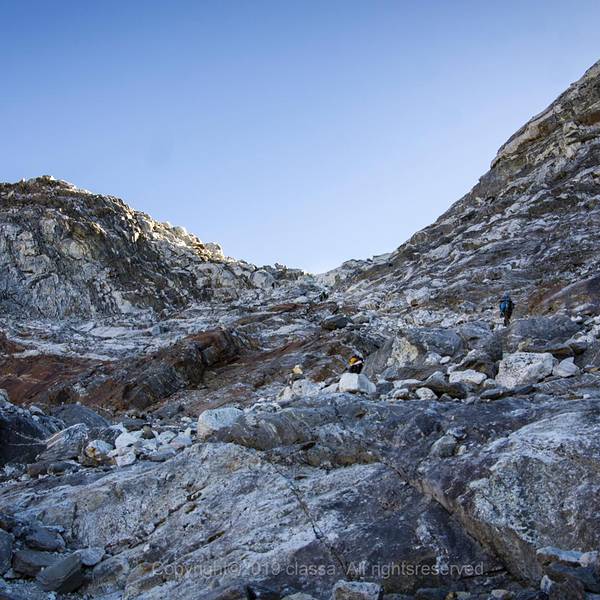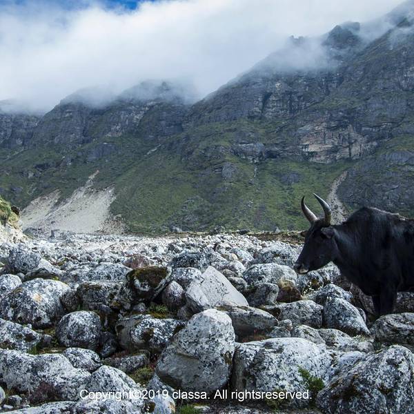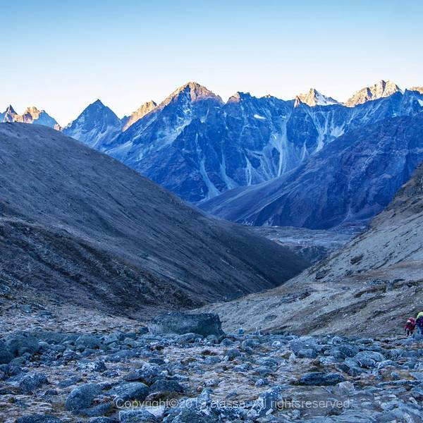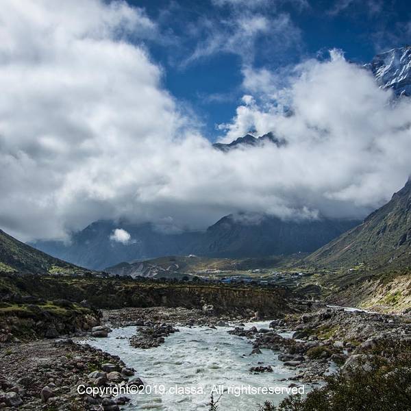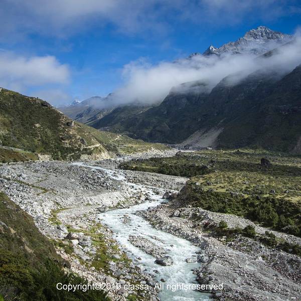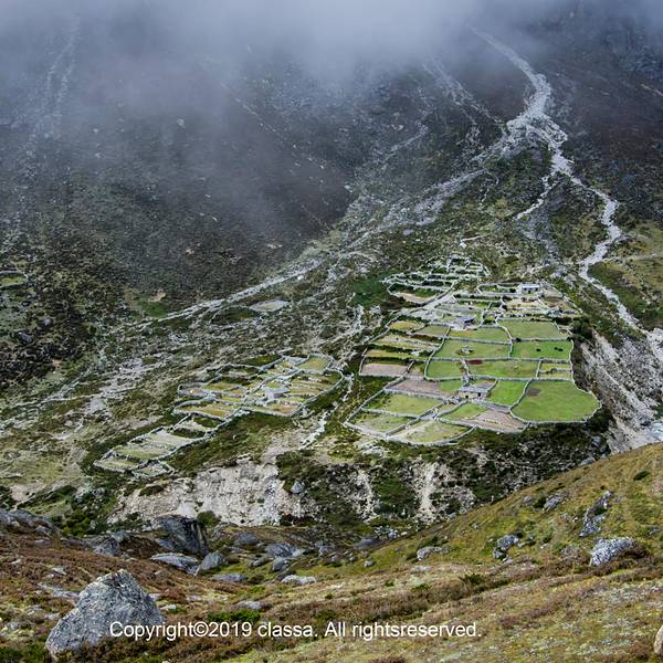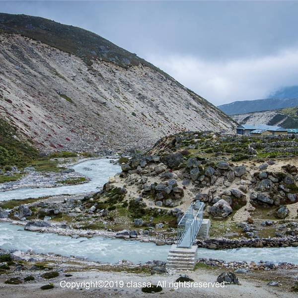 如果说一个地区四季分明,那这里的气候可以不宜人,但风景一定很美丽。在网上一直有人在争论,是四季分明好还是四季不分明好。也许中国正好处于四季分明的北温带,所以大家已经习惯了季节的交替,也就缺少了对这份大自然的赋予的敬畏。如果把你放在赤道附近过上段日子,你也许就会想念这份交替了。今天想和大家说的不是四季分明的辩论,而是有这么一条路,长度不到60公里,但是却能让你感受到四季的变换。走过这里,也就穿越了四季。要问这条路在哪里?它就在喜马拉雅山脚下,尼泊尔境内通往珠峰南坡大本营的途中。这条路从海拔2200米上升到海拔5600米,虽然只有短短60公里,但这里展现给大家的有原始森林,有高山草甸,有湍急的河流,有巍峨的雪山,还有四季的变化。这是进入喜马拉雅山区的第四天,当清晨的阳光普照这片神圣的土地时,我们一天的徒步就又要开始了。这一天的行程从海拔3800米的thame走到海拔4300米的lungden,不到十公里的路程却见识了地貌的变化。从第一天进山到现在,海拔从2200米上升到了3800米。我们逐渐从浓郁的夏季走了出来,身上的衣物也变得厚实起来。回想前几天的日子,终日穿梭在茂密的原始森林中,不时的翻越一条有一条溪流。行走在路上,基本是看不到远处的路,眼前和周围都是茂密的森林。不知什么时候就能听见轰鸣的水声。转过山角,在森林的缝隙中看到的也许是河流,也许是瀑布。20多度的气温配上短袖体恤,就可以完成丛林的穿越。而今天的路程,往日常见的森林逐渐失去了踪影。如果路过山涧,俯视而观,也许还能脚下的山坡上斑驳的树木和贯穿其间的梯田。今天绝大部分行程的景色已经变成了高山草甸。或者更确切的说是漫山遍野的灌木丛。海拔4000米的高度,空气的含氧量已经是平原的70%了。温度的下降,树木已经无法生存了,留下的便是那些一丛一丛的灌木群,在山边,在远方,在脚下。当然这段路程不可缺少的还有河流和巨石。暂且不说河流,单单说散布在灌木丛中的巨石,星罗棋布般的始终占据着视野。人或者牛,只能在其间寻觅,开辟出一条属于自己的道路。也许是阳光的原因,亦或者是水分的因素,有的地方的灌木郁郁葱葱,焕发着春天的朝气;而有的地方的灌木则成金黄色,远处看起来更像是丰收的庄稼,充满了秋天的韵味。也许应该为这几天的幸福生活而感叹,因为在后面的几天时间里,我们始终穿梭在雪山之间。放眼望去,周围都是白皑皑的,届时的天地便纯粹起来了。大家试想下海拔5000米的生活样子是什么?是和向导追问身边十座雪山的名称;是躲着客栈的窗扉前,喝着咖啡,看着那些混乱了名字的雪山;是屋外冰雹转成漫天的雪花,我们在屋里烤着火,是狂风中不停歇的前进。进山第四天,9.56公里的路程换来的是新奇的感受。是随着海拔逐渐变大的风,是天气无常的变幻,是巨石和灌木丛中的探索,也是坚持走下去的信念。