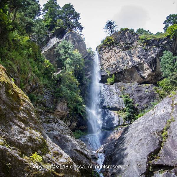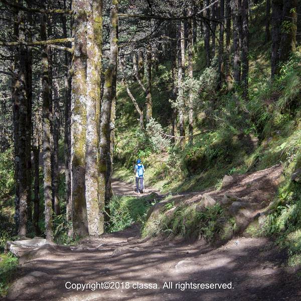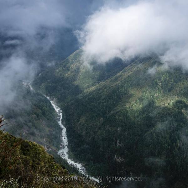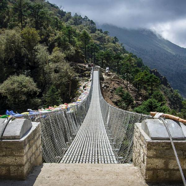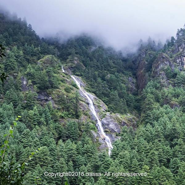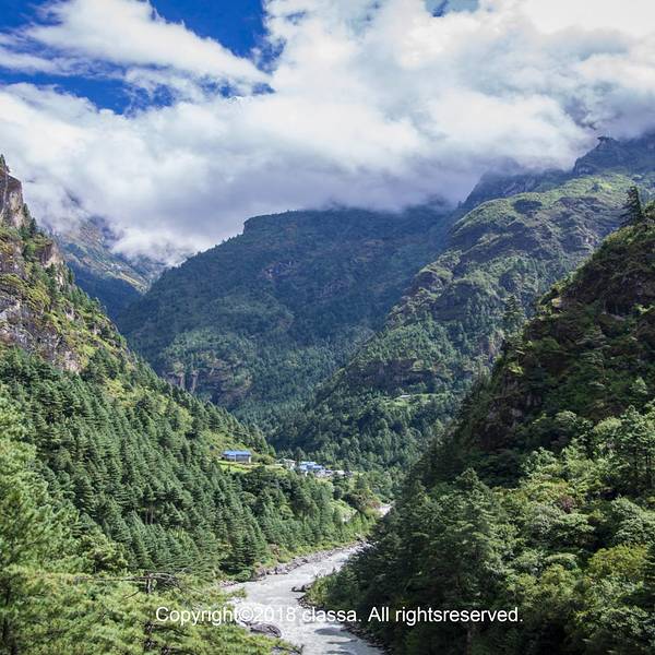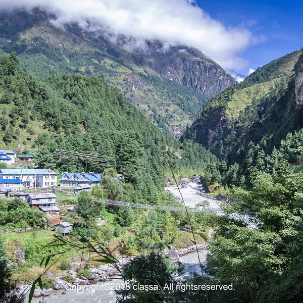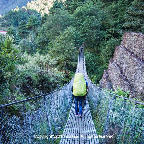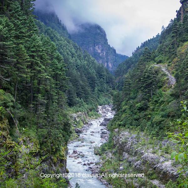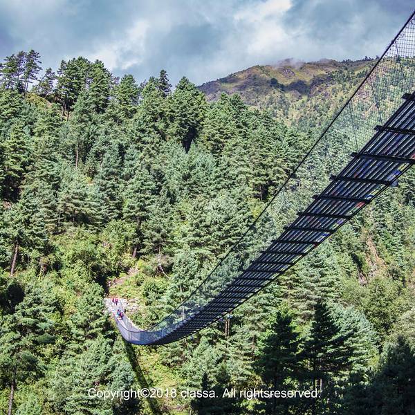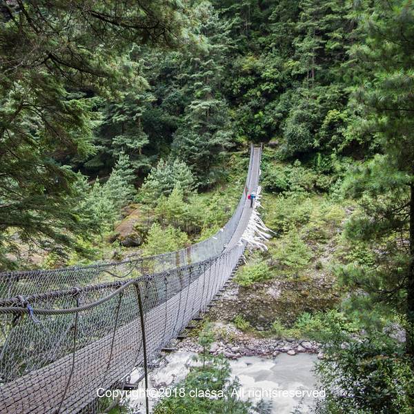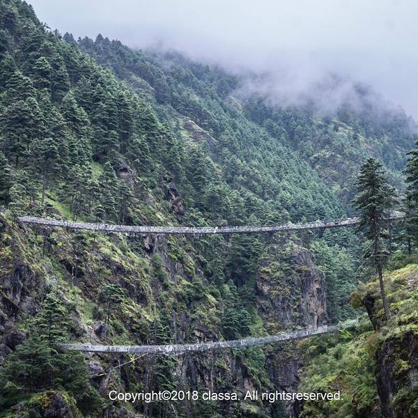 尼泊尔是一个坐落在喜马拉雅山脉上的山地国家。这个国家有三分之二的国土面积都是山区,仅仅靠近印度的地带有一片肥沃的平原。正是如此特殊的地形地貌,使尼泊尔成为了一是个绿色的国度。在尼泊尔境内有着6500多种植物和1000多种野生动物和鸟类。而这些宝贵的生物资源就分布在几处生态保持良好的的原始森林。如果你搜索尼泊尔境内的原始森林,第一个选择一定是奇特旺国家公园的原始森林。每一个来到尼泊尔的人,在选择旅行目的地的时候,总会有一个选项出现在你的菜单中,那就是到奇特旺骑大象。在这片神奇的土地上,野生的犀牛、鳄鱼、大象并不罕见。其实除去奇特旺,尼泊尔境内还有一个原始森林,这片森林处在雪山的怀抱中,从古至今始终保持着淳朴的原始状态。那就是位于喜马拉雅山地的原始森林。这里到现在为止还名不见经传,最主要的原因就是交通不发达。这片区域到现在还是不能通汽车的,所以也就少有人问津了。其实我们走进这片原始森林,相信和所有人来到的人一样,都源于EBC的徒步。从卢卡拉出发进山,一路上的村村镇镇都散落在这片原始的森林中。如果细算下来,我们EBC行程的第二天,整天都是穿梭在原始森林之中。虽然对于辽阔的山地森林,我们只是浅尝而止,一直游走在人类活动的区域,但这仍然不能影响到它对于我们的震撼。由于刚刚进山,我们还处于海拔较低的区域。2000多米的海拔高度,对于小叶片的松柏来说,是足够满足生长环境的。再加上充足的水资源和远离人类生活,这里的原始森林搭配着各种灌木,浓密得覆盖着这里的每一片土地。如果说人类是这片森林的客人的话,那么这里的原住民应该就是牦牛、岩羊了吧。他们躲在山林中,穿梭在峭壁旁,人类不能涉及的区域都是他们的领地。另外由于喜马拉雅南麓本来就温暖多雨,再加上充沛的冰川融水,在森林中行踪经常能够遇到奔腾不息的河流,还有就是沿着山势从天而降的瀑布。人类就在这片秘境中建立了自己的村落。无论是石头堆砌的围墙,还是彩钢板搭建的房屋,都是人工一点点的背上来的。无论是在初进山的时候还是下山的途中,我们总能遇到背负着沉重物资或者建筑材料的人们。人们在村子旁开垦了不大的田地,种植着菜花、马铃薯之类的植物。在村中穿梭时,总能看见勤劳的人们正在田里耕种。五彩的房屋,随处可见的佛塔经幡,围绕着村落的农田,远离了机械化的喧嚣,不见了工业的污染和霓虹的闪烁,这里到有几分世外桃源的感觉。如果说这片原始森林中最大的人文建筑,那一定是挂在山间,链接天堑的桥。从来没有人统计过这片区域有多少桥,就像没人知道这片区域有多少河流一样。但是这些桥却将被河流、峡谷分割的大地连接了起来。由于这片山区目前还没有办法通公路,即使在不远的二三十公里处就有飞机场,山里的所有物资还是要靠人工背上来。所以,在经过峡谷上,河流上的每一个桥梁时,我都不由感叹当地人民的勤劳和毅力。一条条钢索桥,有的几十米,有的上百米,悬挂在密林中,在村庄前,联通了山里的道路,也联通了山里的人。最有意思的就是有些桥还建成为错层式,在半山腰和山顶处分别悬挂,再搭配上围绕在上面的五彩的经幡,从远处望去,好像几条丝带横亘在山间,为这片绿色的大地平添了几分色彩。远处隐约可见的雪山,眼前蜿蜒曲折的河流,悬在山腰的云朵,漫山绿油油的松柏,躲在山间的钢索桥,还有零星散布在山中的村落。眼前的一幕幕组成了一幅画卷,一幅山水写意的画卷,一幅田园风光的画卷,一幅世外桃源的画卷。这幅画简单、淳朴,但又真实、柔美。不经意间,也许你就会爱上这片土地,爱上这片森林和这里脱离凡事的生活。