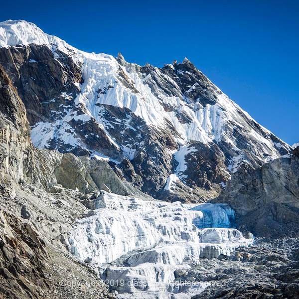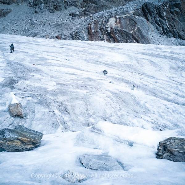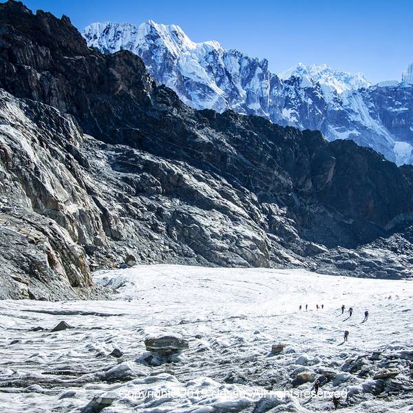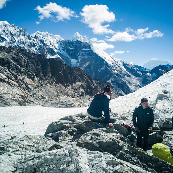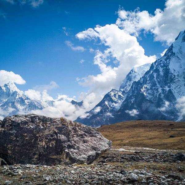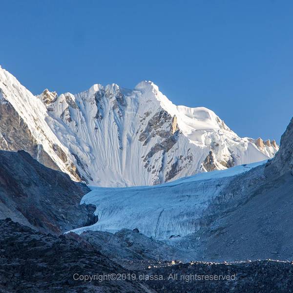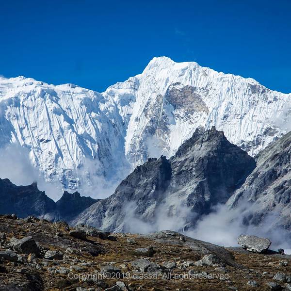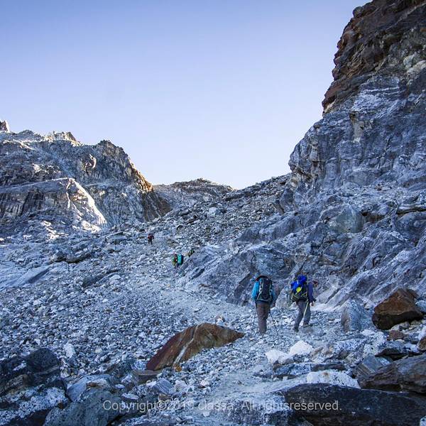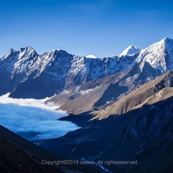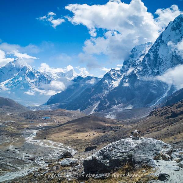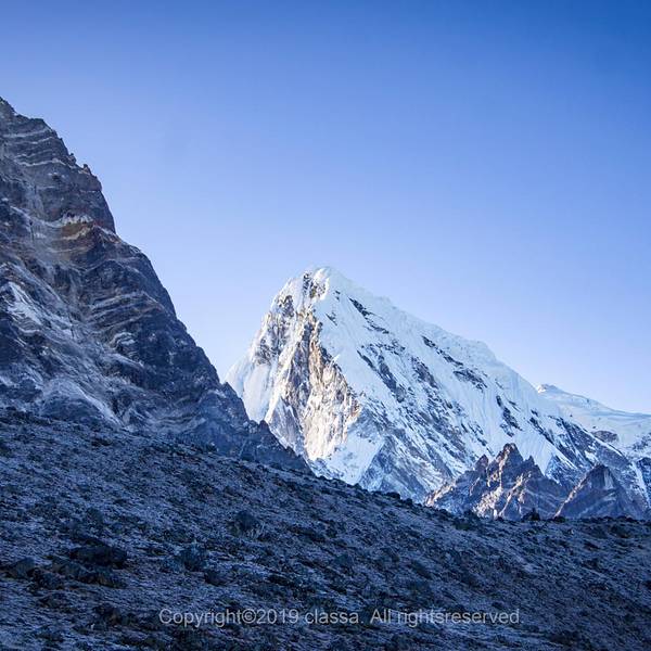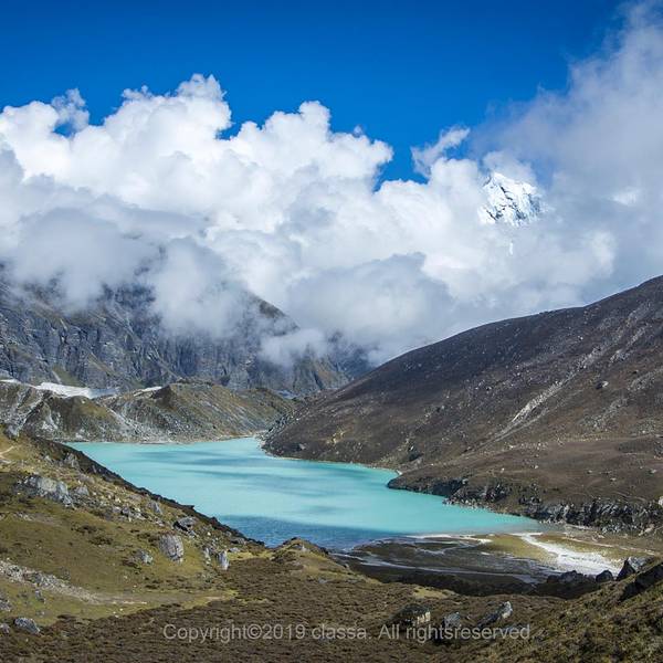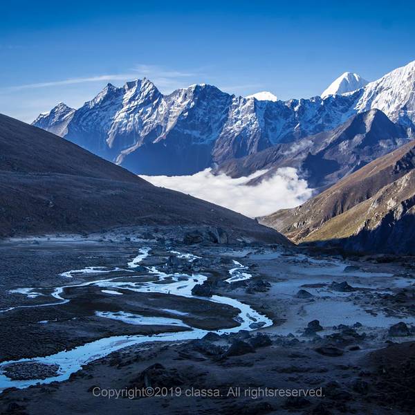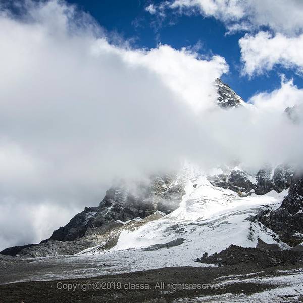 论语中有着这么一句话:“知者乐水,仁者乐山;知者动,仁者静;知者乐,仁者寿。”后来简化后也就成了“智者乐水,仁者乐山”。今天说到这句话,并不是为了深究其中之意。只是想简单地看看山水。随着生活水平的提高,人们越来越向往走出自己熟知的环境,去探索新的领域。有些人爱水,喜欢波涛汹涌的壮阔,喜欢川流不息的跃动。而有些人则爱山,热爱山之稳重不迁,热爱山之巍峨险峻。也许我就属于爱山者,总感觉踏入大山之中才算真正的回归了自然。要说山,每个人心中都有属于自己的那座巅峰。而我心中的那座山,应该是属于喜马拉雅,属于世界上海拔最高的山脉,属于那片世界上最庞大的雪山群。走进喜马拉雅腹地已经是第七天了。从原始森林穿梭到高原穿越,在前几天翻越第一个垭口后,我们已经活动在海拔5000米好几天了。也许是习惯了这种节奏,即使有大的翻越攀升我们也适应了起来。经过前一天的休整,第五湖的美景还依稀在目,我们今天的任务是翻越第二个垭口:卓拉山口。垂直上升964米,越过海拔5368米的垭口,我们再一次置身在雪山环抱之中。在垭口之巅,我们周围分布着Cholo peak、Amadablam、Barunche、Labuche east等一众六七千米的雪山。当你站定环视四周时,你才能够感到这种视觉的震撼。不知道大家是否去过西藏的阿里地区,那里也是雪山环抱,期间散布着色彩斑斓的海子。但是和尼泊尔这边的情况,还是略有不同。西藏的阿里地区是喜马拉雅山脉和冈底斯山脉中间夹着的一块平原。走进阿里地区,你会发现雪山是分两个条状的分布在两边。而在尼泊尔,我们已经进去了喜马拉雅腹地,这里的雪山是360度无死角环绕包围着你。无论你面向何方,总有连绵的雪山进入到你的视野。不得不说EBC翻越垭口的路况实在是差的过分。在翻越第一个垭口Renjo Pass时,垭口两侧的路一侧时大的石板台阶,一侧是碎石土路,倾斜角约是50度的样子,一路上跌跌撞撞,几次摔倒才勉强完成。而今天第二个垭口的路则更加过分。暂且不提两侧的石块路有多难行,单说两侧攀升的角度接近65度,几乎是需要攀爬才能上升。据说后面第三个垭口更加过分,真的需要爬着上升。而不得不说,似乎大美风景总和艰难险阻是相伴的。翻越了这个垭口,也就迎来了视觉上的盛宴。刚从垭口下来不久,我们就要横穿一条冰川。在冰面上行走,将近一公里的长度,虽然不是如履薄冰般小心翼翼,但也需要压抑内心激动的心情,不敢大步行走。从山顶往下看,冰面上的人群,三三两两的仿佛白色海洋中的小蚂蚁。在白色海洋的周围,是延绵至顶的冰川,灰色的山峦和密布的巨石。在翻越垭口后三公里的位置,大美的风景就藏在了这里。眼前的雪山群连绵的仿佛一道屏障,阻断了大地和天空的联系。一条冰川融水汇成的河流流向远方。其间散布着零星的湖泊,碧绿的洒落在黄色的大地上。这时候的云层已经不再高高在上,悬浮在半山腰处仿佛触手可及。此时的雪山颇有几分花朵的意思,不觉间争芳斗艳起来。有的似金字塔一般高耸伫立,有的则断崖切面一般平滑整齐;有的在白雪覆盖中露出岩层,苍劲有力直插云霄,有的则被冰川环绕,白色飘带横贯于身分外妖娆。科普了下,喜马拉雅山脉有110多座海拔7350米以上的雪峰。而整个山脉的平均高度也超过了6000米。在这片雪域中,人总是显得渺小。但即使再渺小,只要你有一颗勇敢的心,雪山环抱就不再遥远。