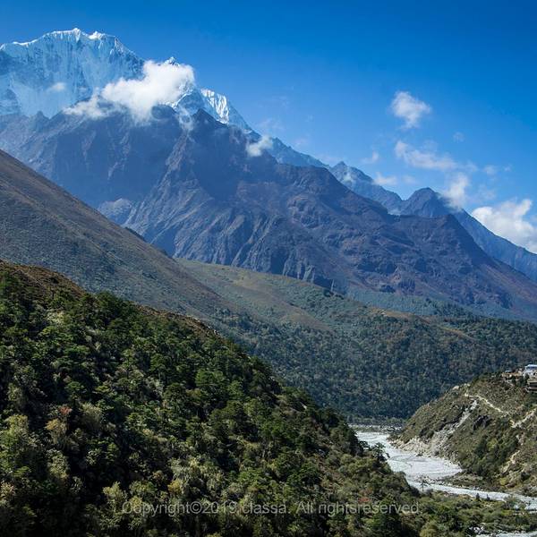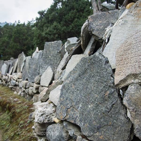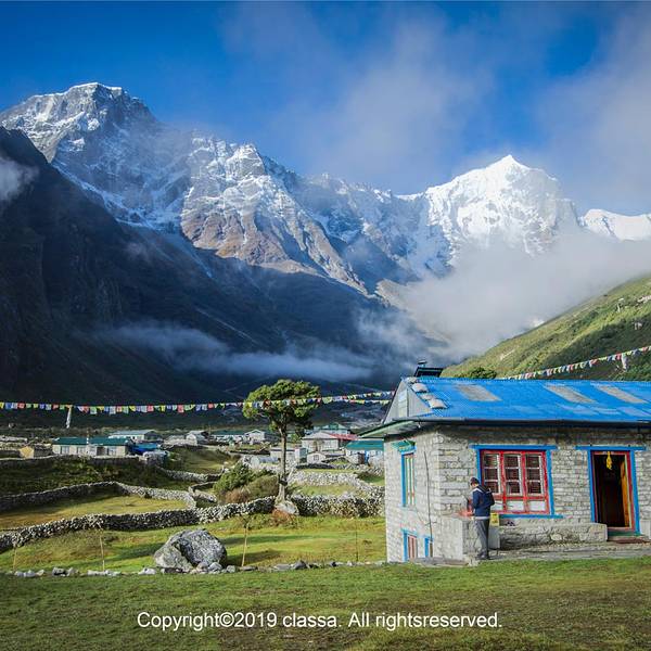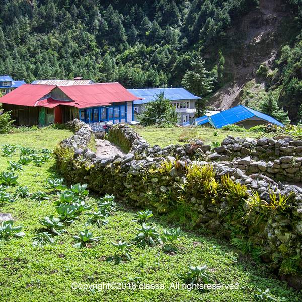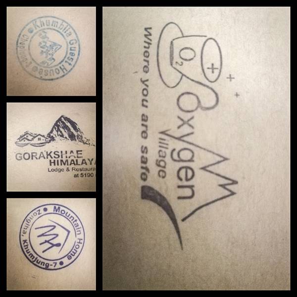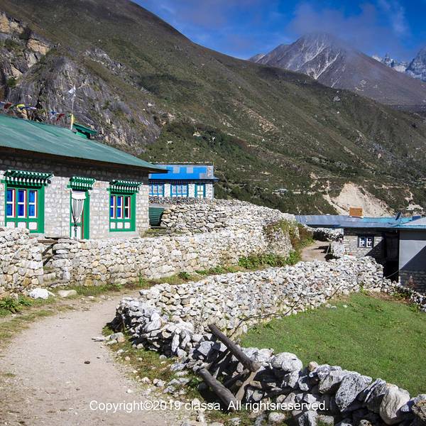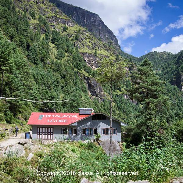 快节奏的都市成活,日新月异的科技发展,让越来越多的现代人改变了一些习惯。那些忙碌的人群逐渐习惯了用汽车来代替步行、用电梯代替了爬楼梯,用电话代替了书信。用窝在沙发上看电视玩手机代替公园内的散步。在钢筋水泥混凝土充斥的世界里,每个人都有一个回归原野的梦想。厌倦了朝九晚五,模式化的生活,是时候该用双脚去探索大自然了。而此时的我,正在这条路上努力的前行着。这是我们走入这片秘境的第11天,也是我们从大本营返程的第2天。身边逐渐变得繁荣起来。沐浴在晨光中,远处的洛子峰和岛峰仿佛一对并肩的兄弟,远远地守护着山坳中的村落。白云始终环绕在山间,久久不能散去。散落在喜马拉雅山区的村落,多用彩钢板做为房顶。这也为这片用白、蓝、绿、黄组成的世界平添了几份变幻。那些聪明的当地人,还用彩绘在房顶上做足了文章,有的喷的是欢迎你来喜马拉雅,有的则是客栈自己的名称,高高望去颇有几分意思。海拔的下降,带来的是雪峰的减少。同样身边的绿色也逐渐多了起来。前几天高原的一马平川又变回了刚入山时的山谷纵横。沿着山边行走,脚下的路经常被山势遮挡。远远的望去,道路的尽头就是云海,那份行走天地间的感觉不能逝去。而再回首,那些陪伴我这么多天的雪峰已经越来越远了。往往一个土丘就挡住了我们的视线。那些留在身边的雪峰也变得有些遥不可及了。不是被山谷挡住了去路,就是被山势遮住了眼睛。还好的是,大地的颜色从高原特有的黄逐渐变回了绿色,眼前的世界也变得生机勃勃起来。不觉间,一些小动物也适时地回到了我们身边。树丛中,岩石上,溪流旁,到处都充满了他们的身影。这也多少缓解了我失落的心情。由于回到了主干道的关系,我们迎面走来的人越来越多。这些来自世界各地的人们,正和他们的背夫一道,踏上征服EBC的道路。我们原本平静了好几天的生活也变得热闹起来了。仿佛是户外界一个不成文的规矩,遇到迎面过来的人总会不自觉的报以微笑并亲切的说声“你好”“加油”或者什么之类的话语。这种在城市里灭绝的习惯,在深山老林中又获得了新生。这一天走下来,我们用蹩脚的尼泊尔语,简单的英语和经常用到的汉语,无数次的重复着这些话,丝毫没有觉得疲倦。而随着海拔的降低,村落也变得密集起来。本来枯燥的徒步生活也变得有趣起来。牦牛队驮着生活物资穿梭在村中的石板路上,家禽悠闲的在田间散步,有几户人家正在修缮围墙或者盖着新的房子,上完了课的僧侣们也开始了自己的生活。不知道是从第几天开始,无意间发现向导们在和客栈老板交流的时候会用到一种印章。后来分析,应该类似于客栈的财务章。向导们每天花的钱会有个账单,届时客栈老板会盖上这个印章。但需要说明的是每个客栈的印章都是不尽相同的。这个不同包含了图案、形状等一系列的东西。和国内的圆章不同,这里每个章都是一个艺术品,可以说代表了老板的对于自己客栈的解读。所以,在徒步旅行的过程中,每天收集印章便成了我本次行程第二个工作。一路下来,望着自己本子上盖满的形状各异的印章,又想起了在珠峰北坡大本营邮局盖的邮戳,心中不由的幸福起来,一股仪式感油然而生。一路下来,无论海拔高低变化,身边伙伴更替,但头顶上的蓝天和雪山一直没有变,我们对于大自然的热爱一直没有变。有人会问,11天下来,每天都面对白皑皑的雪峰,每天都要不停的行走,你不会厌倦吗?仔细想想,还真的不会厌倦。虽然雪峰在上,但是每个雪峰都是独一无二的;虽然一直行走,但眼前的风景却无时无刻的不在变化。也许这就是这片雪域带给我的感受,也是这世界十大徒步路线最受欢迎的原因之一吧。