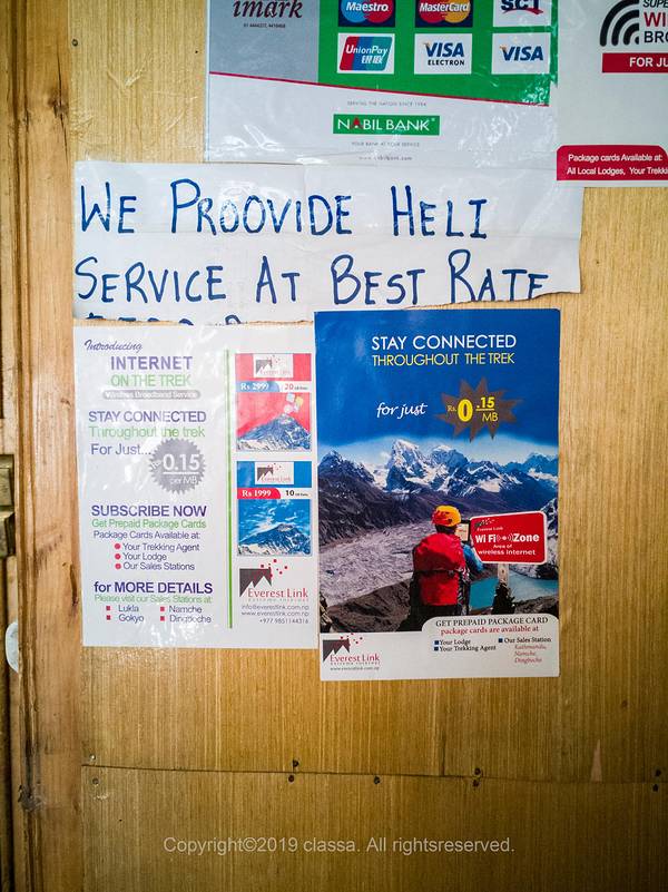 EBC徒步的网络信号,一般分为两个阶段。第一阶段时从卢卡拉开始一直到昆布地区的重镇南池(namche bazar),这一路基本上是有手机信号的,无论是国际漫游还是办理当地的手机卡,都可以满足上网和基本通话的需求。第二阶段就是南池往上到大本营前最后一个村镇gorakshep,这段路是没有任何移动网络信号的!此时手机基本处于失联状态。请大家一定做好心理准备并通知亲属。不过在南池往上的区域里,很多客栈是可以购买珠峰极限网络公司的流量卡。基本上是600卢比1GB的流量。但是有两点需要说明的是:这个流量卡只能绑定到一部手机上使用,更换手机无效。第二点就是每个村落都是独立的流量卡,到达另一个村落就不能使用了。比如你在gokyo买的一张流量卡,只能在gokyo使用。到达另外一个村子thaknak时,原先的流量卡不能使用,你只能重新购买thaknak的流量卡。所以进山的朋友们,你们一定要规划好行程和流量的使用时间,避免浪费。六:其他的琐碎事情
