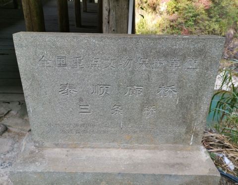 泰顺三条桥,位于洲岭乡和垟溪乡交界溪上。由原先三条巨木跨河为桥而得名,建于宋绍兴七年(1137年)九月十三日",重建于清道光二十三年(1843年),为叠梁式木拱廊桥。