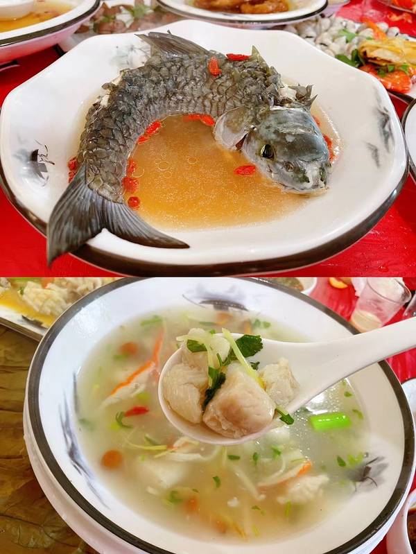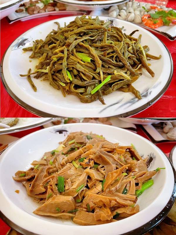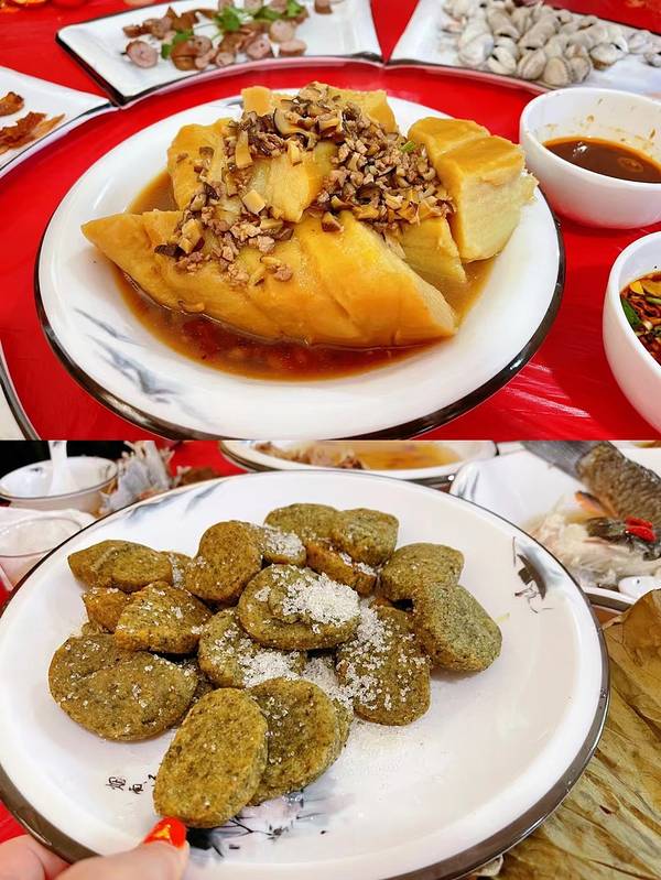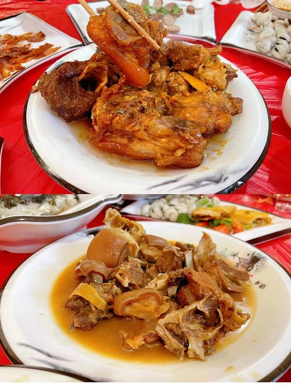 红桌布上凉菜:海蜇-琥珀琉璃,套肠-古道热肠,生姜-半壁江山,醉蟹-八方来财。热菜主食:九层糕-长长久久,仕阳肉丸-金玉满堂,里光博饼-包罗万象。肉类姜丝排骨-吉庆满堂,糕羊清炖-喜气洋洋,爆炒腊兔-大展宏图,茶香家鸡-凤鸣九天。鱼类荷叶清蒸鳗鱼-蒸蒸日上,家烧目鱼-独具慧眼,军鱼汤-鱼跃龙门!海鲜姜酒血蛤-招财进宝,卤水草虾-红红火火。时蔬什锦菜-锦上添花,芥凯冬笋-春回大地,四季豆干-四季发财,清炒山药-步步高升!加上大果盘橘子甘蔗小番茄和现磨豆浆,非常美味的泰顺百家福宴[强][强][强]
