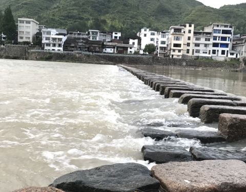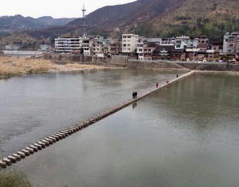 石头搭的跳步桥,涨水的时侯就漫过石头了。这里的河面宽度有一百多米,石头不是随便摆放的,有卵石的...石头搭的跳步桥,涨水的时侯就漫过石头了。这里的河面宽度有一百多米,石头不是随便摆放的,有卵石的基础固定的框架,水不深的时候,在上面蹦来跳去,童趣十足。
