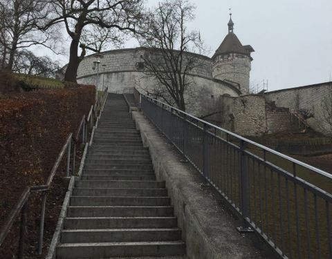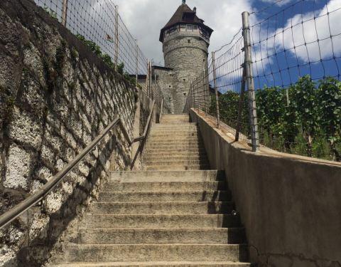从酒店的窗户看出去正好能看到这座城堡,城堡在一座种满葡萄树的小山坡上,应该是小镇的制高点。沙夫豪森没什么特别的景点,所以就爬上去看了看,里面像洞穴阴森森的,可以怕吸血鬼片那种,顶上有洞光束进来,画面挺有感觉的。再往上一层平台放着大炮,可以俯瞰整个小镇。