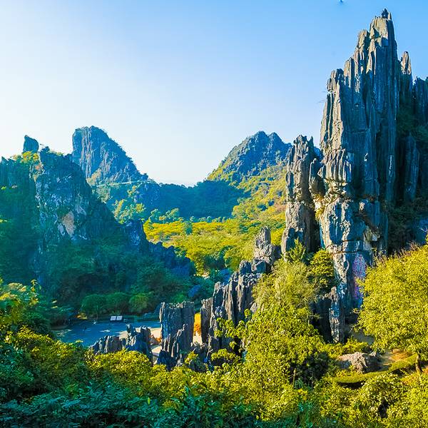 春湾石林又名"莲花洞石林",位于阳春市春湾镇春湾风景区内,占地200多亩阳春旅游资源得天独厚,文化古迹众多,这里风光绮丽,奇峰幽洞,绿水秀山,素有“广东小桂林”之称。春湾石林又名"莲花洞石林",位于阳春市春湾镇春湾风景区内,占地200多亩。距龙宫岩600米,是一大片石林,由"百...阳春旅游资源得天独厚,文化古迹众多,这里风光绮丽,奇峰幽洞,绿水秀山,素有“广东小桂林”之称。春湾石林又名"莲花洞石林",位于阳春市春湾镇春湾风景区内,占地200多亩。距龙宫岩600米,是一大片石林,由"百页剑门"、"马头峰"等6座石山峰峦组成,最壮观的是石剑峰,也叫百页剑门,如刀枪剑戟,挺拔陡峭、直插云天。著名诗人韦丘吟为"万把青铜剑,锋芒指夜天,将军何处去,战马系槽前",广为传诵。春湾石林是典型石灰岩溶洞,四周为六座山峰所包围,恰好似六瓣莲花。山上有一些奇石,马头峰、骆驼峰、莲蓬峰、蛤蚧石、观音拜月石、仙人过坳石、百页剑门等怪石。从百页剑门进入石林,石峰诡异,景色万千。通天蜡烛位于阳春市春湾镇府后侧春湾中山公园湖畔,高近100米,底宽30米,是春湾石群中拔地擎天的圆柱形奇峰。峰顶有一石突起,形似烛蕊一般,因此叫“通天蜡烛”。 展开