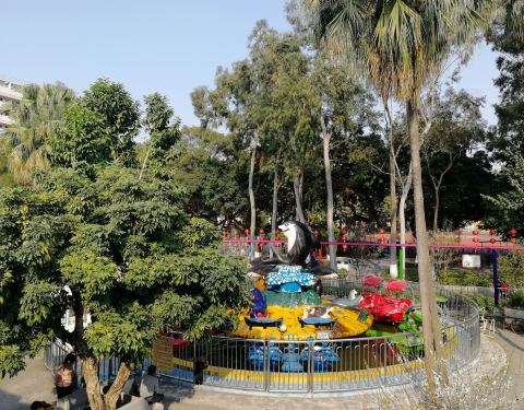 【景色】 【趣味】 东莞人民公园非常之大,带老人孩子去散步不错,有很多孩子们喜欢的机动娱乐设施,海岛船、空中踩单车、碰碰车等,这次去我和女儿玩海盗船,太刺激了!