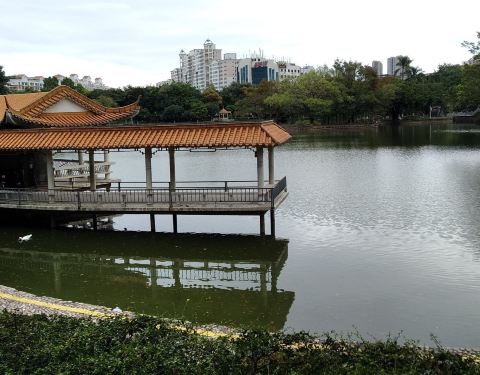 东莞人民公园――纯粹为了消磨多余的休闲时光!晚餐前的热身活动。公园位于老城区中心地带,园内面积广大,绿树成荫、湖景与山林都挺漂亮,适合休闲活动。门外是老旧的博物馆与图书馆、科学馆,如今都在南城中心广场建了全新的现代化场馆了。