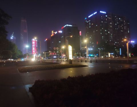 晚上的时候,灯光下,风景还不错。中心广场在东莞南城街道新城市中心,分南北两广场,这里是南广场