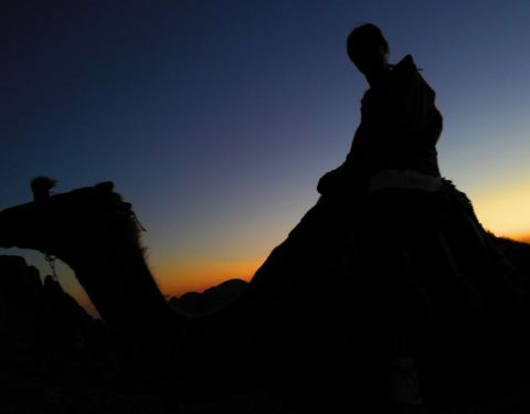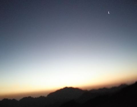 夜登西奈山。 刚出声色犬马之所,便又进入一片洪荒之中。原来即使在现代,文明也只是被茫茫荒原包围的一个据点,更何况古人出塞之苍凉心境了。巨大的山形构成一幢幢黑影陡然而立,如刀劈斧砍般;山峰鳞次节比,绵延不绝;一轮弯月挂在山头,背景是漫天繁星做的幕墙。想起一句“皓月冷千山”来,一种荒蛮质朴之壮美跃然眼前。 我们终于在凌晨一点多来到了西奈山脚下,想不到这里停了不少大巴,与我们一同“自虐”。刚离开比基尼盛行的海滨,到这里竟然寒气逼人,需要穿上上海带来的全部衣服。出发前我们围成一圈,将手掌一重一重搭在一起,以示相互鼓励。 我们列队而行,走的是盘旋而上的“骆驼小道”,身旁不停有贝都因人牵着骆驼经过,为走不动的人提供便利。路上没有灯,却给西奈平添一份神秘和壮观。抬头仰望,黑色的巨峰显得那么宏伟而高不可攀。我从未见过这样壮观的星空,深邃的苍穹幕上,银河如倾泻而出,恒星洒满了天空,闪亮着光芒,召唤着众生走近它。 骆驼小道的尽头接着750级悔罪台阶,是登顶的最后一段路。陡峭蜿蜒的台阶在黑夜里尤显艰难,它让人收起任何征服的欲望,顶礼膜拜般走向终点。