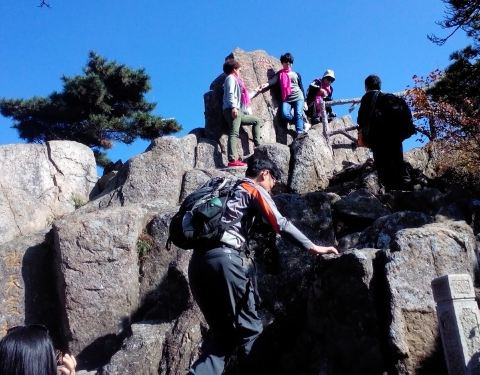 上始信峰时先会看到接引松,路右面山谷里是仙人下棋,上峰顶的路很窄接引松旁只能通一人,上山的人这...上始信峰时先会看到接引松,路右面山谷里是仙人下棋,上峰顶的路很窄接引松旁只能通一人,上山的人这排了会队等这侧下山的走过(始信峰另一边也有下山路)再往上走。左下就是北海宾馆了
