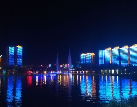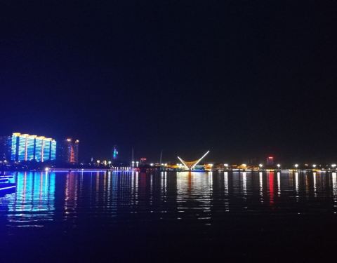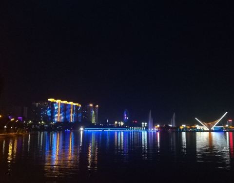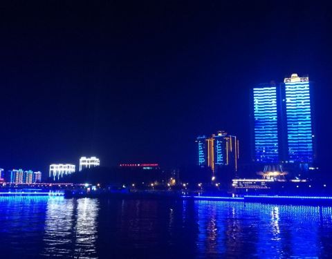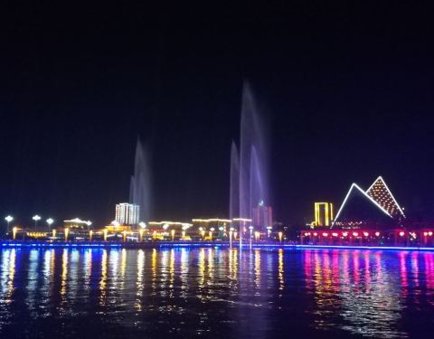 夜景不错。河边家属楼外灯光变换图案配合喷泉,景色很美。适合饭后散步。河中小岛上有美食。没其他的了