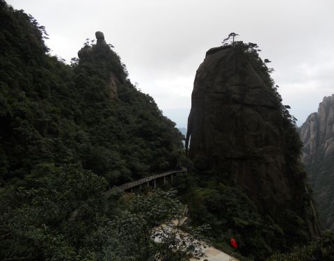 神龙戏松位于江西上饶玉山县境内的三清山风景区内的流露台景点不远处,是一个像形的独立山峰,其倾面有一柱状石柱如同一条龙望着山顶的青松,故命名,但我感觉像大象的鼻子。