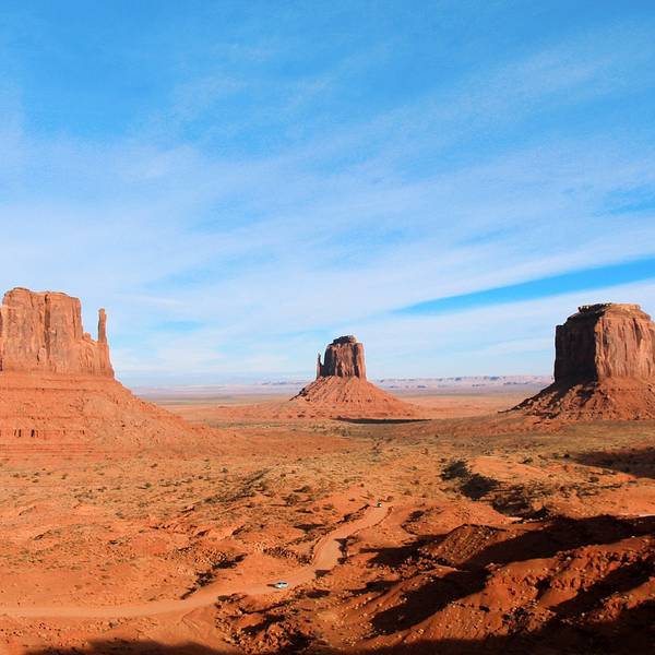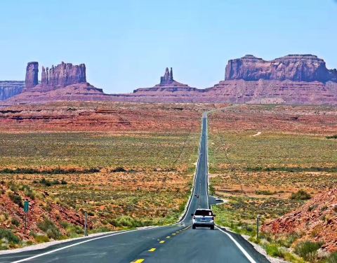 纪念碑谷的全称是纪念碑谷纳瓦霍部落公园,位于亚利桑那州与犹他州交界的纳瓦伙族印第安人保留地里,它是美国十大迷人沙漠之一,风景雄伟。 这里特殊地貌的成因是远古落基山的堆积物沉积于此,并转变成沙岩,由于地层压力不断挤压,导致地表断裂隆起,加上风雨的侵蚀,就变成了如今的古城遗迹般的景致。 整个景区没有铺设行车道,原生态的道路崎岖颠簸,除了自驾,你还可以选择乘坐当地印第安人的敞篷车,坐上车顶观景台上的座位,一路看两旁戈壁美景。