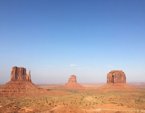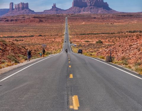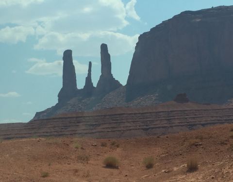 里面的路基本是unpaved,尘土很大,简单点说就是开两个小时车看石头,赶时间的朋友就在外面拍拍照就好,我们行程比较松就进去转了一圈。尽管我看所有的石头都差不多,但是他们真的每个还都有自己的名字,下面这个就叫3 sisters,恩估计不是一个妈生的吧。前往Moab的路上,马路边会有车停着,因为这条公路是《阿甘正传》里,阿甘跑步的道路。我们看到了几个印度人坐在马路上拍照,这条路虽然车不是很多,但还是有点危险。传说纪念碑谷是美西的标志,《风语者》、《阿甘正传》、《变形金刚4》、《西部世界》等都是在这里取景的,地图上也写着“where the earth meets the sky”,可是我除了已经记不清剧情的《变形金刚4》以外,这些电影一部都没看过。