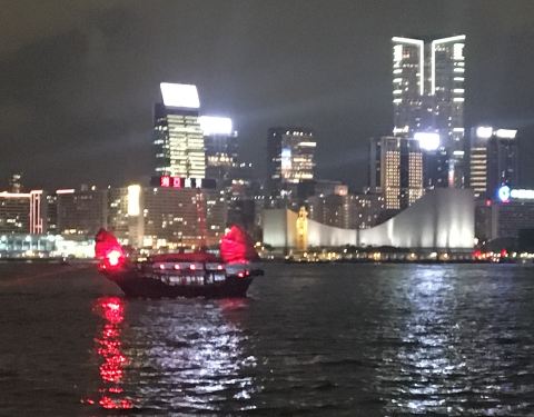 ...的木质结构的帆船,历史悠久,帆是红色的,晚上坐着帆船,吹吹海风,看看维多利亚港的美景,何等惬意