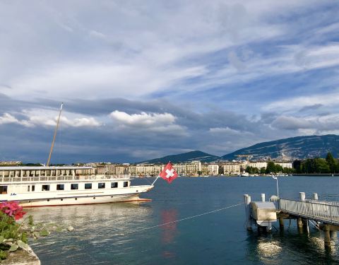 乘坐游船领略日内瓦湖岸边美景,看湖水、雪山和蓝天连成一片。