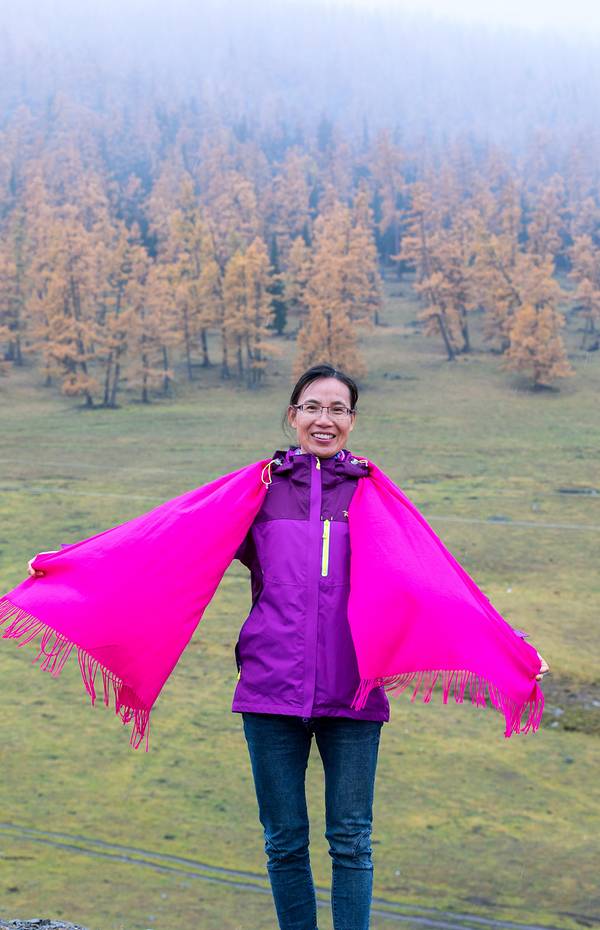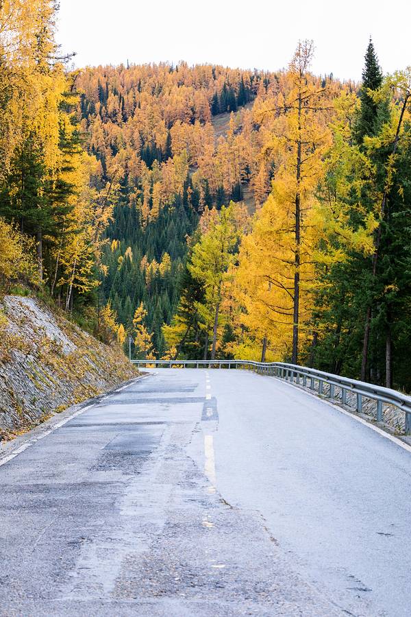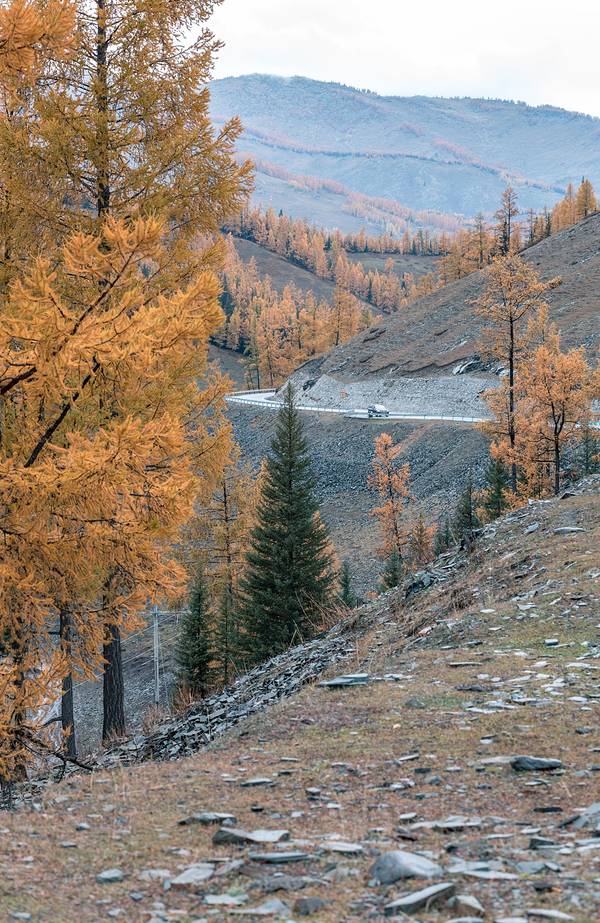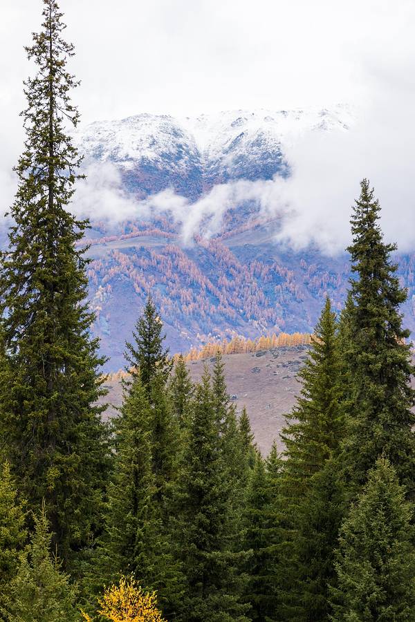 过了红土地,再进山,就是到达喀纳斯最后的盘山公路了,也是最美的一段,尤其在这淅沥沥的雨天。与前面的两座山不一样的是,这里开始稀稀疏疏的出现了西伯利亚的落叶松、红杉等,这些在我们只存在于阿尔泰地区的树种。越往后,山峦叠嶂,草木丰茂,弯弯曲曲的柏油路与这些崇山、杉树形成了一幅美丽的画圈,这样的景色可不是随处可见,阴暗的天空镶嵌山谷之间,稀疏的雨水洒落林间小路,下车拍照,即使天空还在下雨,即使两侧的汽车呼啸而过。