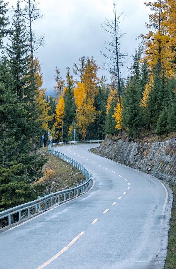 沿着林间柏油路一直开着,拍着,中途会经过一个路口,向左去往贾登峪喀纳斯,向右前往禾木。按照既定的行程,我们先前往贾登峪喀纳斯。一路开下去就能到贾登峪国家森林公园。