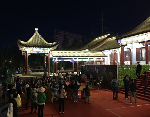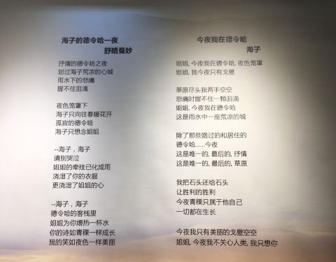 巴音河从德令哈市区穿过,在下游有拦水坝,使市中心的这段河面非常宽阔。加上夜晚两岸灯火与河中彩色喷泉交相辉映,流光溢彩,巴音河的夜景大有不是江南胜似江南的感觉。诗人海子一篇“姐姐,今夜我在德令哈”让这座高原小城闻名遐迩。德令哈城区不大,当年诗人很可能“握着悲痛的泪滴”,在巴音河边徘徊。如今我站在河畔,却看不出“这是雨水中一座荒凉的城”,也许那份“荒凉”已被海子深埋在心中带走了。走过大桥,来到河西岸,不远处就是海子诗歌陈列馆。已是晚上9点,居然没有关门。陈列馆虽然面积不大,但展品不少,有海子的诗作、手稿、图片、书籍,影像资料等,免费参观。当时馆里有十几个观众,看上去都是文艺青年。陈列馆门前,正在举办诗歌朗诵会,海子生前不会想到,是他使这座城市具有了“文艺范儿”。离开展馆返回酒店时,有人在河边放起了焰火,五彩缤纷的礼花绽放在巴音河上空。今夜,我在德令哈。