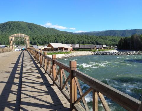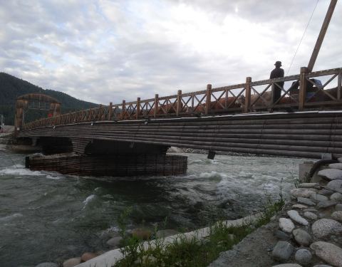 这是一座全木结构的桥梁,横跨禾木河,联通图瓦村与对岸的观景平台,桥面平整,桥下河水清澈、平缓,周边群山环抱,自然风光非常优美。