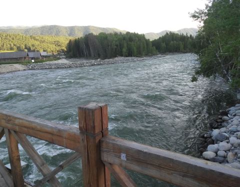 ...,是一个木制的桥梁,非常漂亮,河边的景色非常美,每天都有很多人从桥上经过去高地,俯瞰整个禾木村