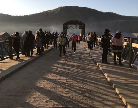 禾木村口的木桥,跨在禾木河上,算是禾木村比较标志的景点禾木村口的木桥,跨在禾木河上,算是禾木村比较标志的景点。现在桥面挺宽,似乎是水泥的桥面了,不过不让过机动车。