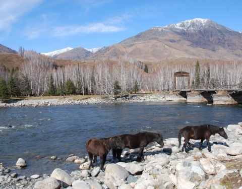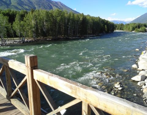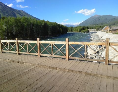 横跨禾木河,联通图瓦村与对岸的观景平台,桥面平整,桥下河水清澈、平缓,周边群山环抱,自然风光非常优美