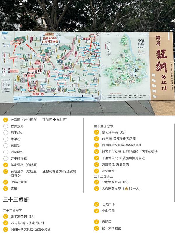5.长堤广场(13.50) 距上一站:1.8km 《狂飙》打卡地图,后面附的地图就是这里拍的 这里也是高齐强和高启盛来找大嫂的地方 高大的老树,树下很多休息的椅子,没有蚊子的时候这里是休息的好地方6.中山公园(14.05) 距上一站:200m逛累了人挤人的三十三虚街,来这里避一避人群,真的很舒服,大口吸氧,虽然园顶没有很高,但是却可以俯看三十三虚街,风景很好,很舒服,顶部的“中山纪念堂”也可以进去看看,里面不大,几分钟就走完