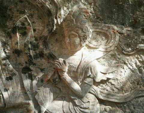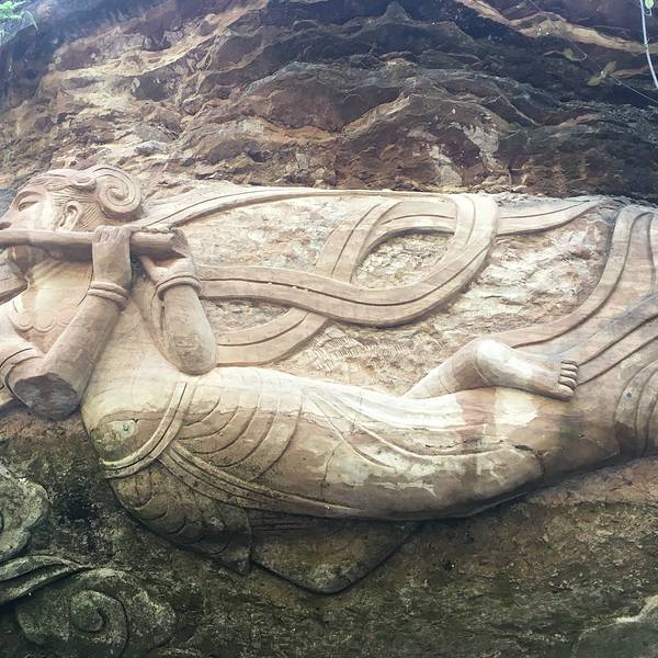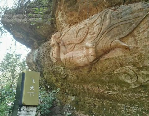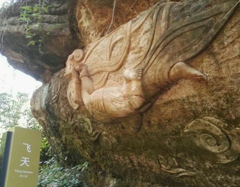 来凤仙佛寺飞天石刻:在仙佛古寺牌楼下方不远处,通向万佛谷上入口处路旁一侧的巨石上,有一组石刻,...