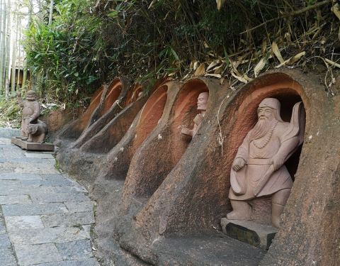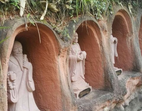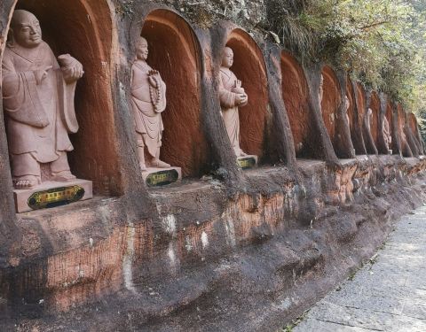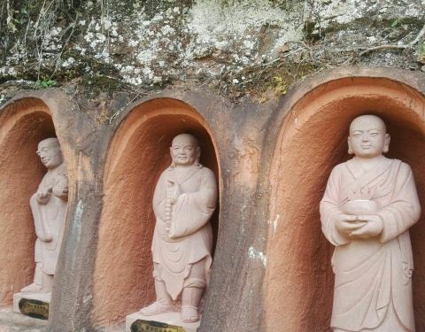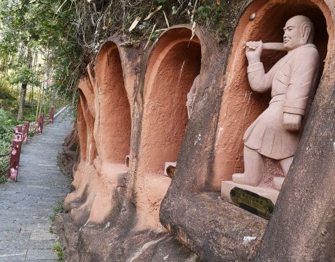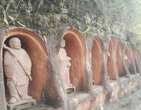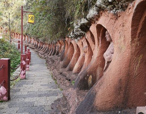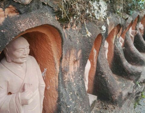 来凤仙佛寺万佛谷:在仙佛寺翰墨碑林左侧,有一长约2千米的峡谷,峡谷一侧崖壁上开凿出许多约1.5...来凤仙佛寺万佛谷:在仙佛寺翰墨碑林左侧,有一长约2千米的峡谷,峡谷一侧崖壁上开凿出许多约1.5米高的石窟,每窟中雕有一尊者,其形态各异,面相慈祥,栩栩如生,令人称奇。