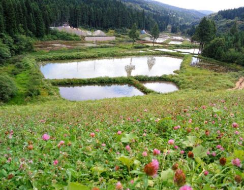 通往福宝山的路好像很久没有修缮了,有几段不好走。颠簸着走了好长时间,才到了山顶。千多米的海拔,视野极度开阔,美妙壮丽的田园风光净收眼底。看到了景区大门,竟然没有人值守。看来还是人富不缺钱呀。景区里有一片湖,湖面平静如镜,湖边的植物长得异常的茂盛。加上没什么游人,犹如到了仙境一般。这里的风景,完全是原生态的。可惜知道的人不多,来的人更少。也许是这里的人光顾着种烟去了,这点小财就不放在眼里了。