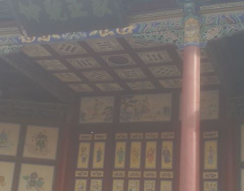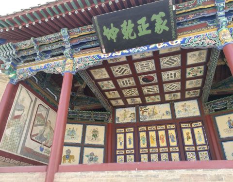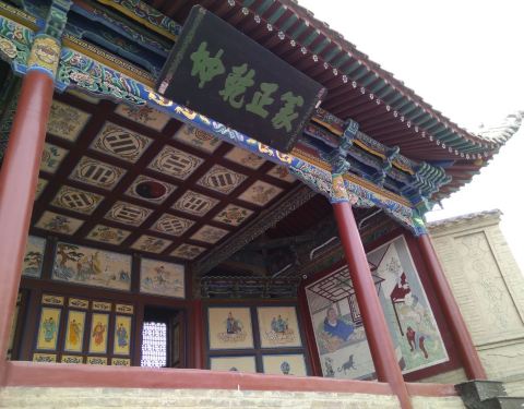 这个戏台挺有意思,寻常太极图都是黑白的,它是黑红的这个戏台挺有意思,寻常太极图都是黑白的,它是黑红的。两面壁画是老和尚偷看良家妇女喂奶。导游说这是佛道两派互黑,或者当年的丙丁寂寞画来解闷的