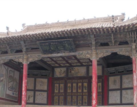 戏台屋顶上方画有红黑太极图,红代表战士的鲜血。正前方画有八仙过海的人物。两侧有和尚偷窥图和尼姑哺孽图。戏台搭建的非常高,当时便于三千人观看。在旅游高峰,戏台定时上演秦腔。