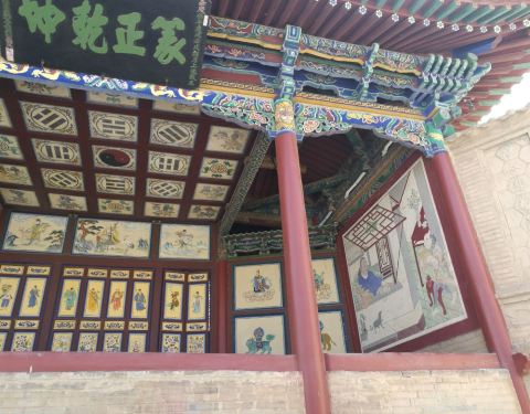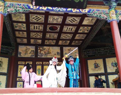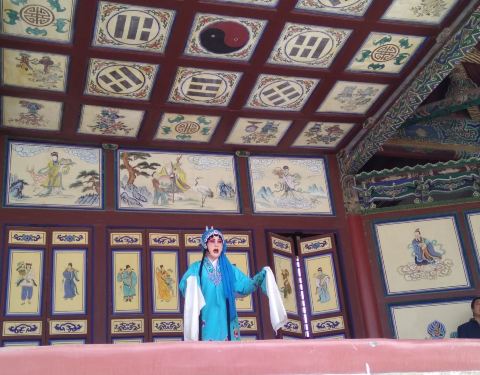 戏台搭建的非常高,当时便于三千人观看。戏台屋顶上方画有红黑太极图,红代表战士的鲜血戏台屋顶上方画有红黑太极图,红代表战士的鲜血。正前方画有八仙过海的人物。两侧有和尚偷窥图和尼姑哺孽图。戏台搭建的非常高,当时便于三千人观看。在旅游高峰,戏台定时上演秦腔。
