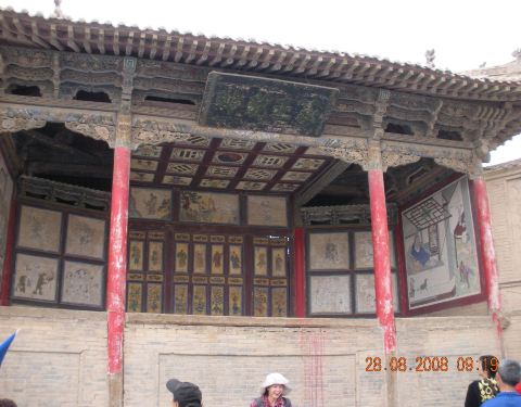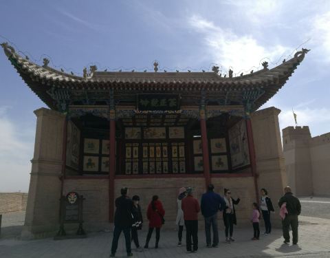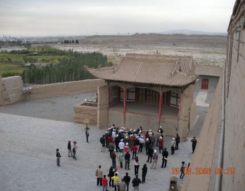 在嘉峪关关城外,是一个典型的古戏台。戏台上雕龙画柱,有许多彩绘,有很高的艺术价值