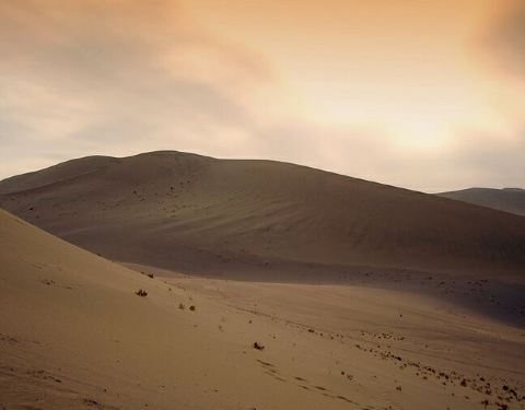 游客很少,整个地区显得十分干燥,放眼望去,远处都是无边无际的沙漠,风很大,扬起的风尘吹得很远,...