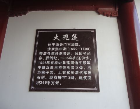 大观蓬是个规模很小寺庙,这里环境很好,供奉的是汉白玉持莲观音立像,很宏伟,是个佛家圣地。