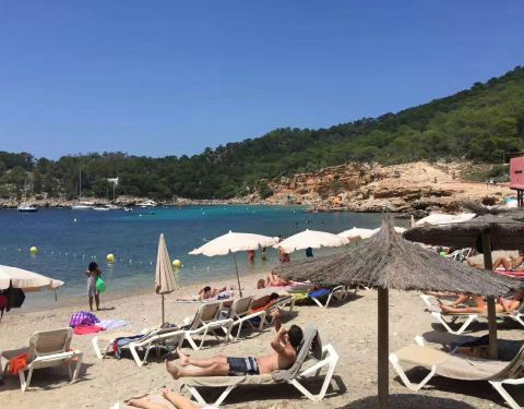 福门特拉岛上有很多沙滩,几乎每个角落都可看到游客在尽情地享受阳光沐浴,很多私家游艇停靠在浅水处,主人们通常和家人们下船在沙滩附近游水嬉戏,快乐的享受着!水是清澈无比,山不高,以矮木丛为主。这是我们第一天的沐浴之地,算是小型沙滩,相比之下,这边水质算是差点。当天气温超过40度,几乎天天温度相似,没有50+防晒油,恐怕要变人干了!游客几乎以西班牙人为主,部分来自邻国的其他欧洲国,极少极少可以见到亚洲人的影子。